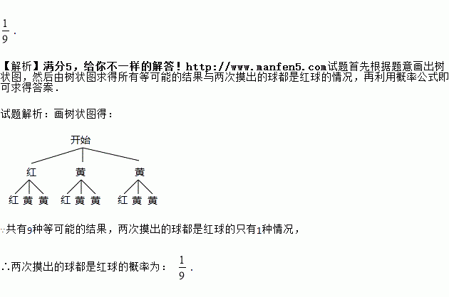 一只不透明袋子中装有1个红球、2个黄球,这些球除颜色外都相同。小明搅匀后从中意摸出一个球,记录颜色后放回、搅匀,再从中任意摸出1个球。用画树状图或列表法列出摸出球的所有等可能情况,并求两次摸出的球都是红球的概率。