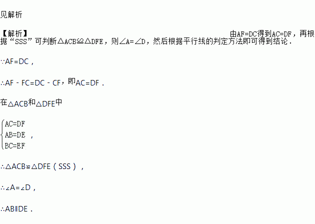 如图,点A、C、F、D在同一直线上,AF=DC,AB=DE,BC=EF,求证:AB∥DE.