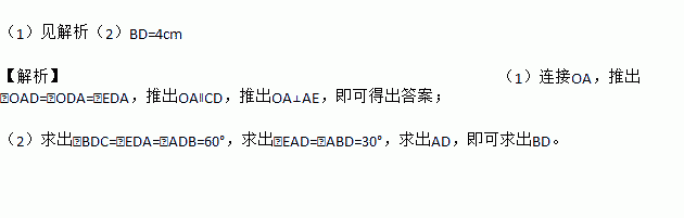 (1)见解析(2)BD=4cm 【解析】(1)连接OA,推出∠OAD=∠ODA=∠EDA,推出OA∥CD,推出OA⊥AE,即可得出答案; (2)求出∠BDC=∠EDA=∠ADB=60°,求出∠EAD=∠ABD=30°,求出AD,即可求出BD。