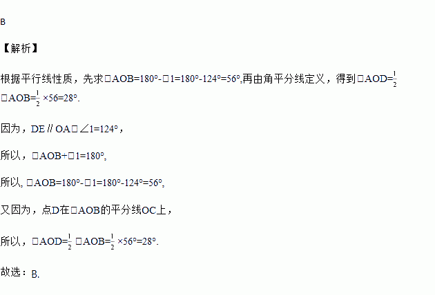 如图,点D在∠AOB的平分线OC上,点E在OB上,DE∥OA,∠1=124°,则∠AOD的度数为( )