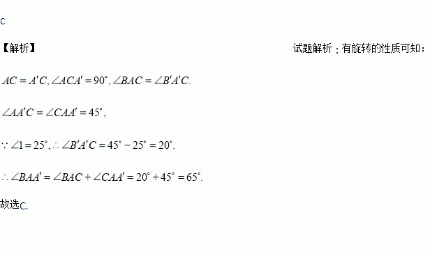 如图,将Rt△ABC绕直角顶点C顺时针旋转90°,得到△A′B′C,连接AA′,若∠1=25°,则∠BAA′的度数是( )