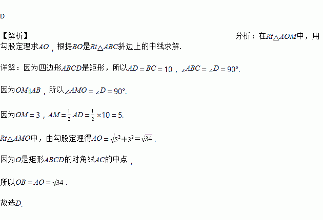如图,点O是矩形ABCD的对角线AC的中点,OM//AB交AD于点M,若OM=3,BC=10,则OB的长为( )