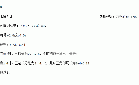 三角形两边长分别为3和6,第三边是方程的解,则这个三角形的周长是( )