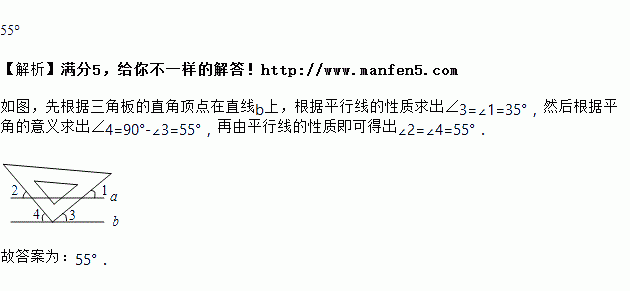 如图,已知a // b,小亮把三角板的直角顶点放在直线b上.若∠1=35°,则∠2的度数为________.