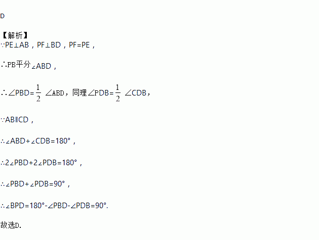 如图,已知AB∥CD,PE⊥AB,PF⊥BD,PG⊥CD,垂足分别E、F、G,且PF=PG=PE,则∠BPD=( ).
