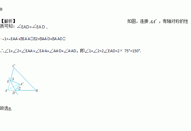如图,在折纸活动中,小明制作了一张△ABC纸片,点D,E分别在边AB,AC上,将△ABC沿着DE折叠压平,点A与A′重合.若∠A=75°,则∠1+∠2=( )