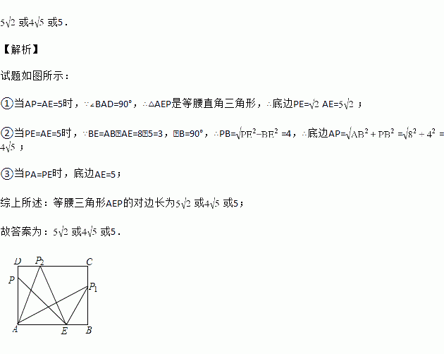 如图是一张长方形纸片ABCD,已知AB=8,AD=7,E为AB上一点,AE=5,现要剪下一张等腰三角形纸片(△AEP),使点P落在长方形ABCD的某一条边上,则等腰三角形AEP的底边长是 .