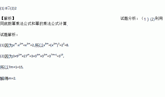 (1) 8;(2)2 【解析】试题分析:(1)(2)利用同底数幂乘法公式和幂的乘法公式计算. 试题解析: (1)因为xm·x2m=x3m=2,所以x9m=(x3m)3=23=8. (2)因为3×92m×27m=3×34m×33m=37m+1=315, 所以7m+1=15, 解得m=2.