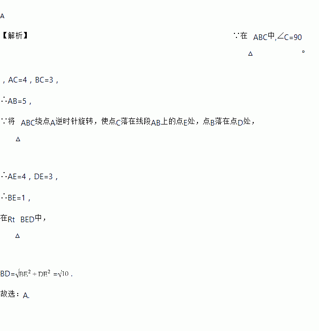 如图,在△ABC中,∠C=90°,AC=4,BC=3,将△ABC绕点A逆时针旋转,使点C落在线段AB上的点E处,点B落在点D处,则B、D两点间的距离为( )