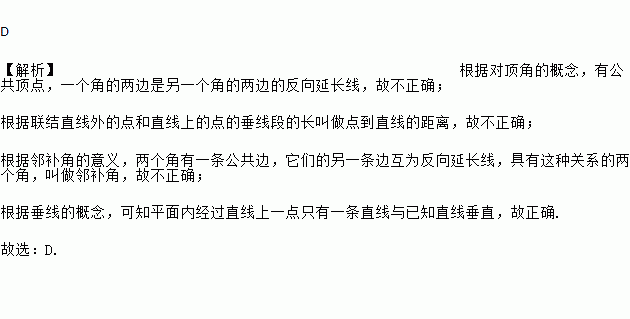 D. 平面内经过直线上一点只有一条直线与已知直线垂直