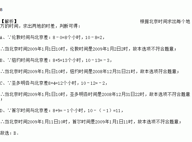 B 【解析】根据北京时间求出每个地方的时间,求出两地的时差,判断可得: A、∵伦敦时间与北京差:8﹣0=8个小时,10﹣8=2, ∴当北京时间2009年1月1日10时,伦敦时间是2009年1月2日2时,故本选项不符合题意; B、∵纽约时间与北京差:8+5=13个小时,10﹣13=﹣3, ∴当北京时间2009年1月1日10时,纽约时间是2008年12月31日21时,故本...