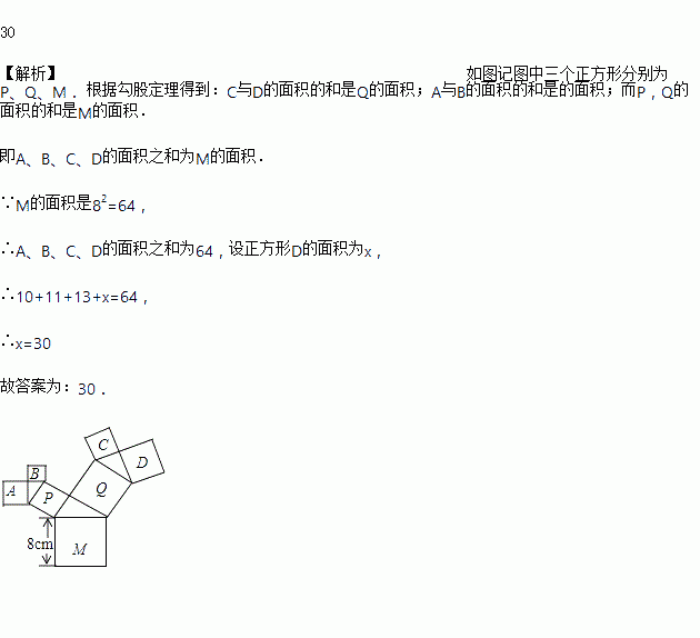 如图所有的四边形都是正方形,所有的三角形都是直角三角形,其中最大的正方形的边长为8,正方形A的面积是10,B的面积是11,C的面积是13,则D的面积之为________.