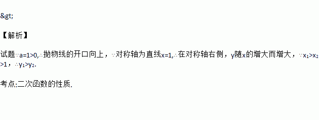 已知点A(x1,y1)、B(x2,y2)在二次函数y=(x﹣1)2+1的图象上,若x1>x2>1,则y1_____y2(填“>”、“<”或“=”).