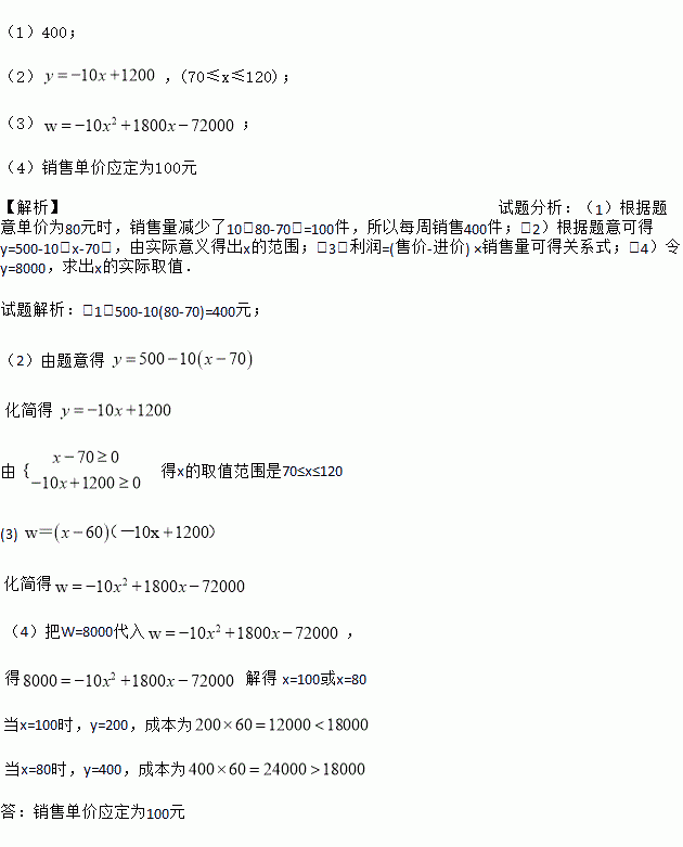 (1)400; (2),(70≤x≤120); (3); (4)销售单价应定为100元 【解析】试题分析:(1)根据题意单价为80元时,销售量减少了10(80-70)=100件,所以每周销售400件;(2)根据题意可得y=500-10(x-70),由实际意义得出x的范围;(3)利润=(售价-进价) ×销售量可得关系式;(4)令y=8000,求出x的实际取值. 试题解析...