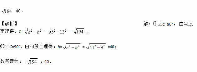 40. 【解析】【解析】 ①∠C=90°, 由勾股定理得:c= = = ; ②∠C=90°,由勾股定理得:b== =40; 故答案为: ;40.