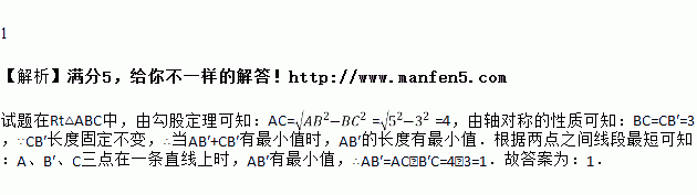 如图,在△ABC中,∠ACB=90°,AB=5,BC=3,P是AB边上的动点(不与点B重合),将△BCP沿CP所在的直线翻折,得到△B′CP,连接B′A,则B′A长度的最小值是________.