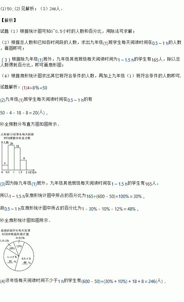 (3)除九年级(1)班外,九年级其他班级每天阅读时间为1~1.5 h的学生有165人,请你补全扇形统计图.