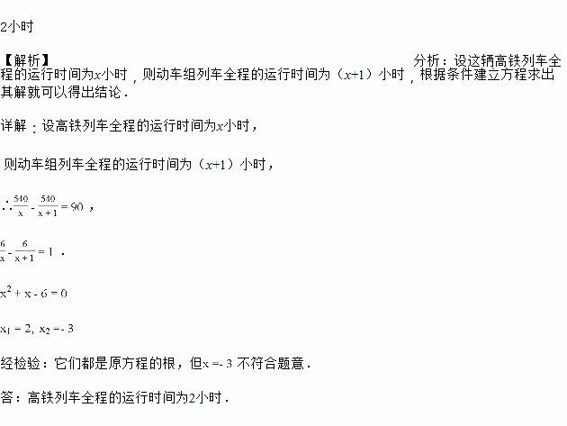 某条高速铁路全长540公里,高铁列车与动车组列车在该高速铁路上运行时,高铁列车的平均速度比动车组列车每小时快90公里,因此全程少用1小时,求高铁列车全程的运行时间.