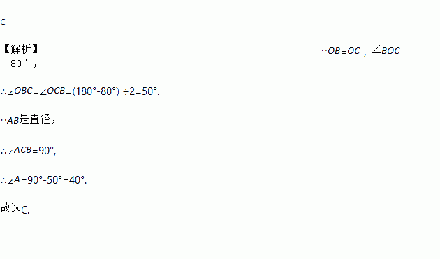 如图所示,⊙O是△ABC的外接圆,AB是直径,若∠BOC=80°,则∠A等于 ( )