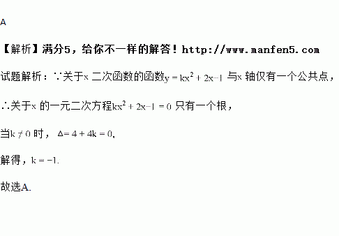 若关于x的二次函数 y=kx2+2x-1与 x轴只有一个交点,则实数k的值为( )