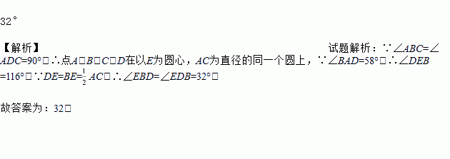如图,在四边形ABCD中,∠ABC=∠ADC=90°,E为对角线AC的中点,连接BE,ED,BD.若∠BAD=58°,则∠EBD的度数为_____度.