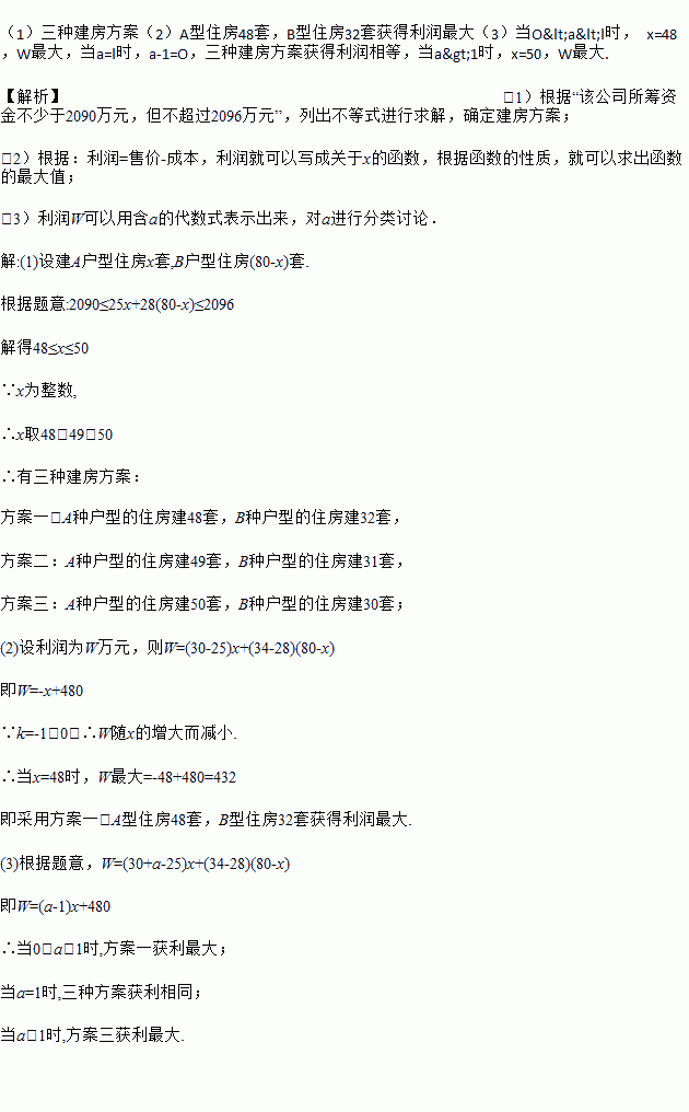 (1)三种建房方案(2)A型住房48套,B型住房32套获得利润最大(3)当O<a<l时, x=48,W最大,当a=l时,a-1=O,三种建房方案获得利润相等,当a>1时,x=50,W最大. 【解析】(1)根据“该公司所筹资金不少于2090万元,但不超过2096万元”,列出不等式进行求解,确定建房方案; (2)根据:利润=售价-成本,利润就可以写成关于x的函数,根据函数...