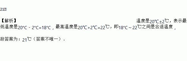 21℃ 【解析】温度是20℃±2℃,表示最低温度是20℃﹣2℃=18℃,最高温度是20℃+2℃=22℃,即18℃~22℃之间是合适温度, 故答案为:21℃(答案不唯一).