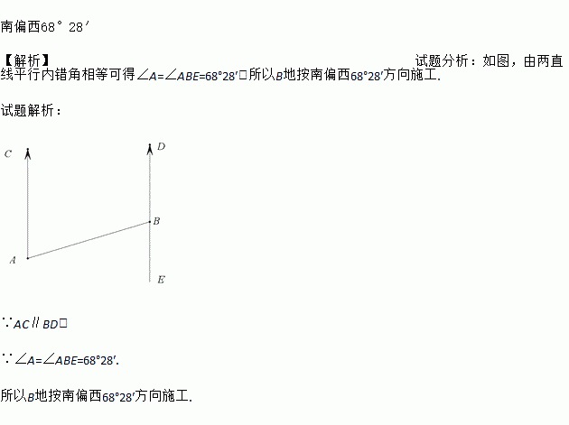 如图,A、B两地之间是一座山,一条铁路要通过A、B两地,在A地测得铁路走向是北偏东68°28′,如果A、B两地同时开工,那么在B地按什么方向施工才能使铁路在山腹中准确接通,请说明理由.