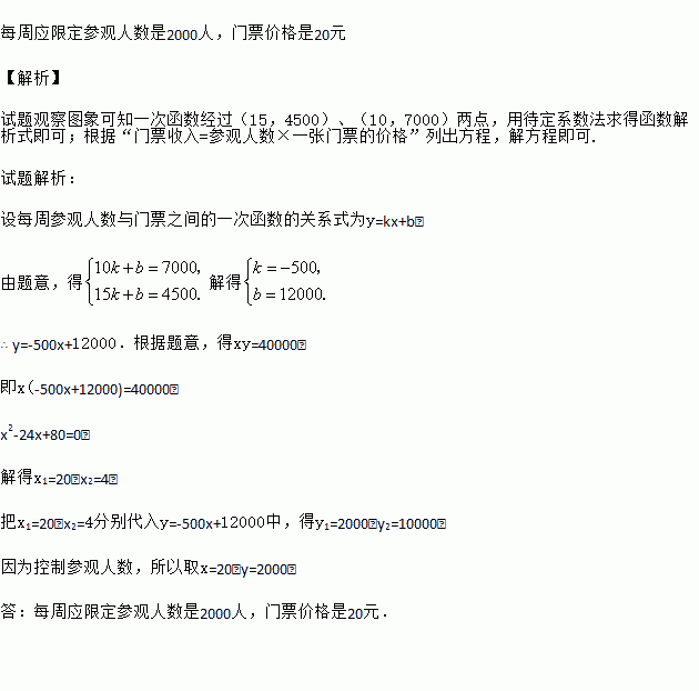某博物馆每周都吸引大量中外游客前来参观,如果游客过多,对馆中的珍贵文物会产生不利影响,但同时考虑到文物的修缮和保存费用问题,还要保证一定的门票收入,因此,博物馆采取了涨浮门票价格的方法来控制参观人数,在该方法实施过程中发现:每周参观人数与票价之间存在着如图所示的一次函数关系.在这种情况下,如果要保证每周万元的门票收入,那么每周应限定参观人数是多少?门票价格应是多少.![]()