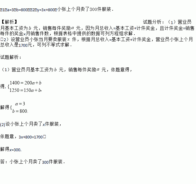 (1)a=3,b=800;(2)y=3x+800,小张上个月卖了300件服装. 【解析】试题分析:(1)营业员月基本工资为元,销售每件奖励元,因为月总收入=基本工资+计件奖金,且计件奖金=销售每件的奖金×月销售件数,根据表格中提供的数据可列方程组求解. (2)设营业员小张当月要卖服装件,根据月总收入=基本工资+计件奖金,营业员小张上个月总收入是1700元,可列不等式求解. 试题解析:...