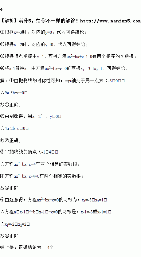 已知二次函数y=ax2+bx+c的图象如图所示,下列结论:①9a﹣3b+c=0;②4a﹣2b+c>0;③方程ax2+bx+c﹣4=0有两个相等的实数根;④方程a(x﹣1)2+b(x﹣1)+c=0的两根是x1=﹣2,x2=2.其中正确结论的个数是_________.