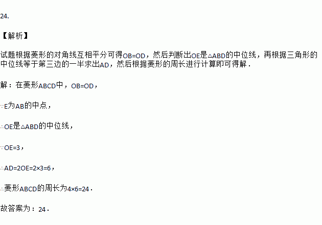 在菱形ABCD中,E为AB的中点,OE=3,则菱形ABCD的周长为 .