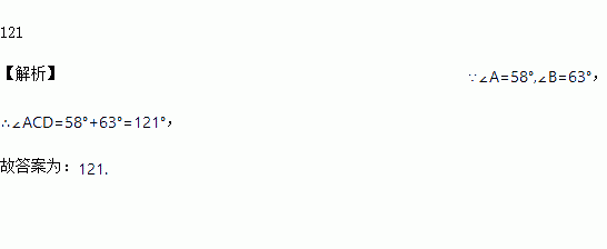 如图,在△ABC中,∠A=58°,∠B=63°,则外角∠ACD=__________度。