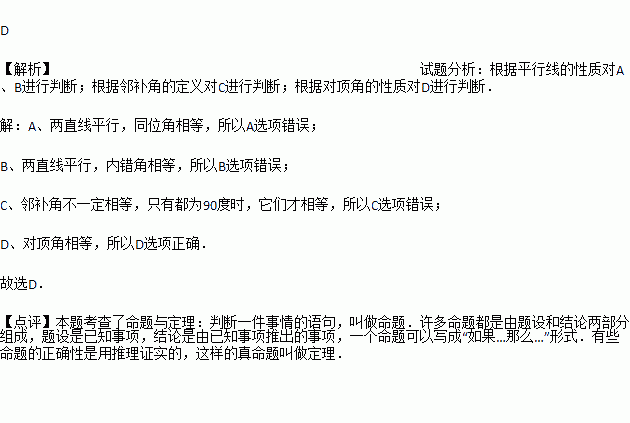 A. 同位角相等 B. 内错角相等 C. 邻补角相等 D. 对顶角相等