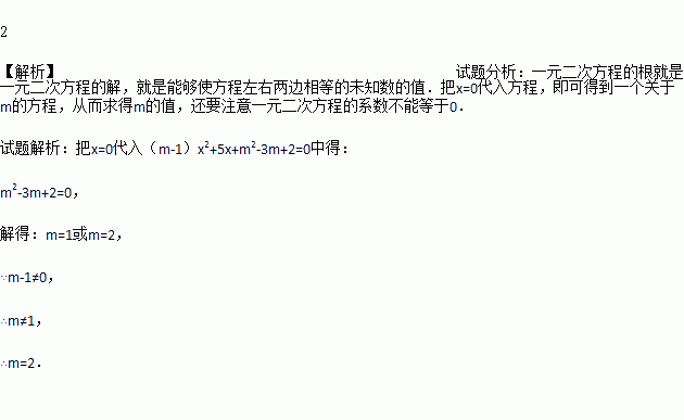 若关于x的一元二次方程(m﹣1)x2+5x+m2﹣3m+2=0的常数项为0,则m的值等于_______.