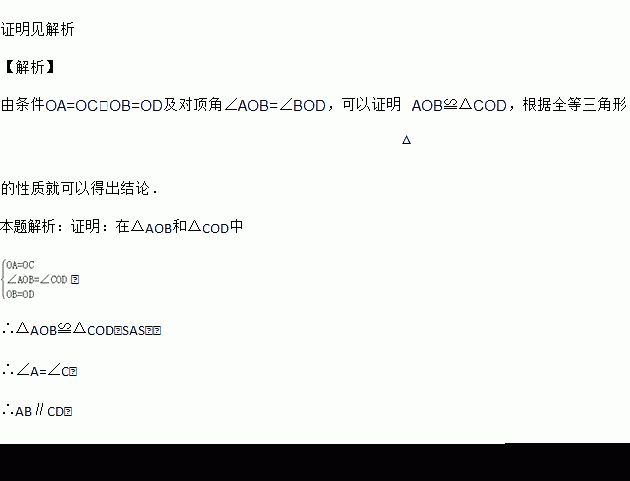 如图,AC和BD相交于点O,OA=OC,OB=OD,求证:AB∥CD