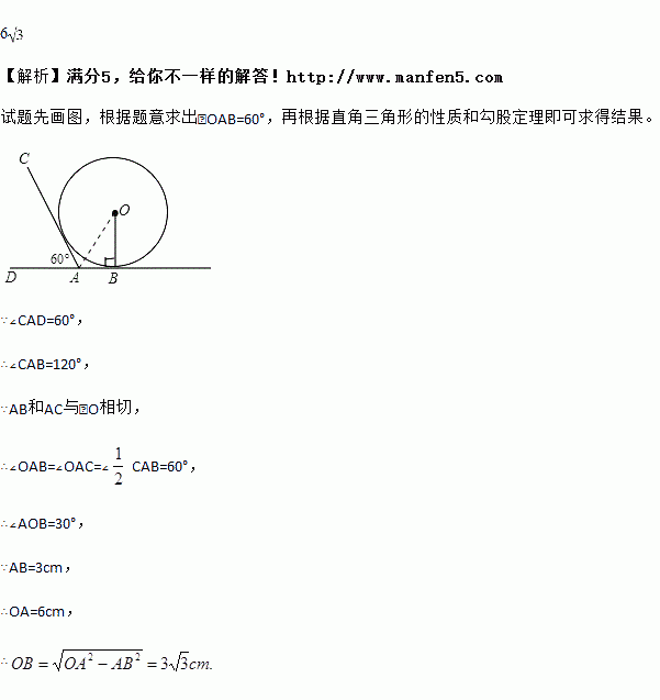 小明同学测量一个光盘的直径,他只有一把直尺和一块三角尺,他将直尺、光盘和三角尺按图所示方法放置于桌面上,并量出AB=3 cm,则此光盘的直径是________ cm.