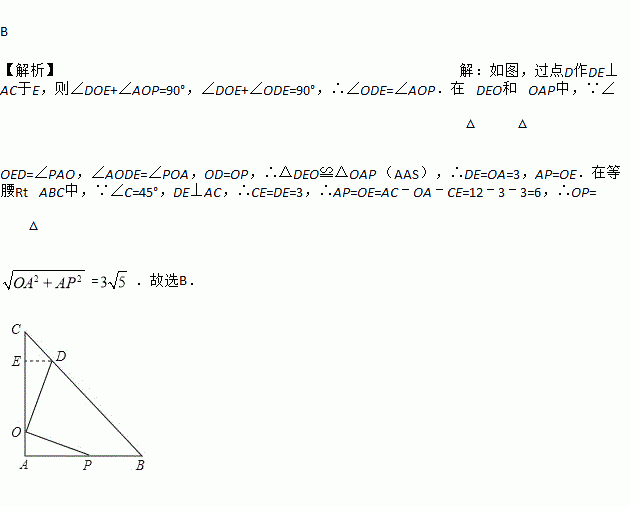 如图,在等腰Rt△ABC中,∠A=90°,AC=12,点O在AC上,且AO=3,点P是AB上一动点,连接OP,将线段OP绕点O逆时针旋转90°得到线段OD,要使点D恰好落在BC边上,则OP的长等于( )