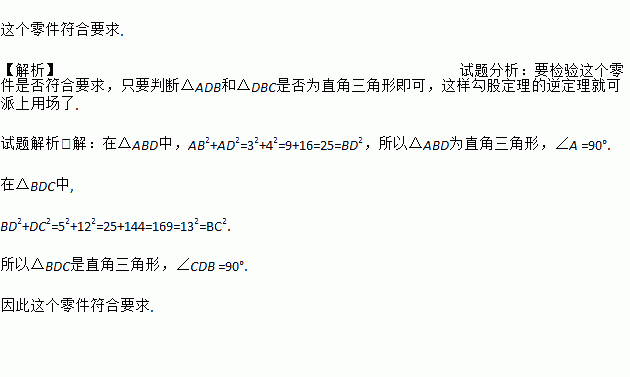 一个零件的形状如图,按规定这个零件中∠A与∠BDC都应为直角,工人师傅量得零件各边尺寸:AD=4,AB=3,BD=5,DC=12 , BC=13,这个零件符合要求吗?