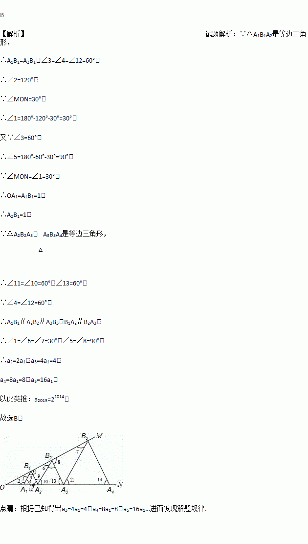 如图,∠MON=30°,点A1、A2、A3…在射线ON上,点B1、B2、B3…在射线OM上,△A1B1A2、△A2B2A3、△A3B3A4…均为等边三角形,从左起第1个等边三角形的边长记为a1,第2个等边三角形的边长记为a2,以此类推.若OA1=1,则a2015=( )
