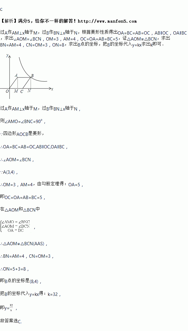 如图,菱形OABC的顶点A的坐标为(3,4),顶点C在x轴的正半轴上,反比例函数y=(x>0)的图象经过顶点B,则反比例函数的表达式为( )