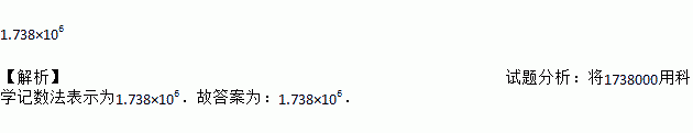 1.738×106 【解析】试题分析:将1738000用科学记数法表示为1.738×106.故答案为:1.738×106.