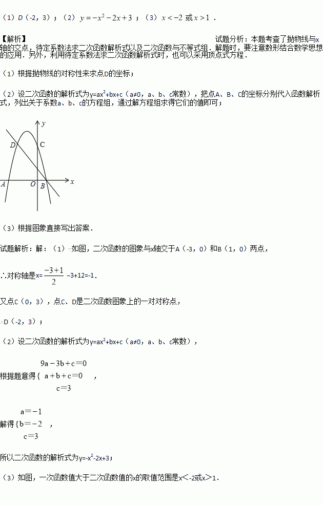 如图,二次函数的图象与x轴交于A(﹣3,0)和B(1,0)两点,交y轴于点C(0,3),点C、D是二次函数图象上的一对对称点,一次函数的图象过点B、D.