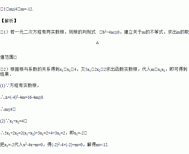 (2)若方程两实数根为x1,x2,且满足5x1+2x2=2,求实数m的值.