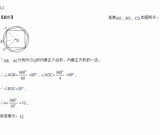 如图,AB,AC分别为⊙O的内接正六边形,内接正方形的一边,BC是圆内接n边形的一边,则n等于_____.