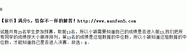 某校有25名同学参加某比赛,预赛成绩各不相同,取前13名参加决赛,其中一名同学已经知道自己的成绩,能否进入决赛,只需要再知道这25名同学成绩的( )