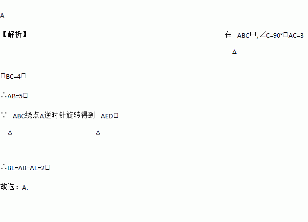 如图,在△ABC中,∠C=90°,AC=3,BC=4,将△ABC绕点A逆时针旋转,使点C落在线段AB上点E处,点B落在点D处,则线段BE的长度为 ( )