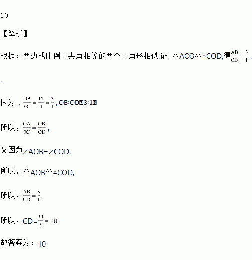 已知线段AD,BC相交于点O,OB∶OD=3∶1,OA=12 cm,OC=4 cm,AB=30 cm,则CD=_______cm.