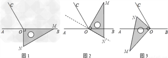 如图1,点O为直线AB上一点,过点O作射线OC,使∠BOC=120°.将一直角三角板的直角顶点放在点O处,一边OM在射线OB上,另一边ON在直线AB的下方.(1)将图1中的三角板绕点O逆时针旋转至图2,使一边OM在∠BOC的内部,且恰好平分∠BOC.问:此时直线ON是否平分∠AOC?请说明理由.(2)将图1中的三角板绕点O以每秒6°的速度沿逆时针方向旋转一周,在旋转的过程中,第t秒时,直线ON恰好平分锐角∠AOC,则t的值为_________ (直接写出结果).(3)将图1中的三角板绕点O顺时针旋转至图3,使ON在∠AOC的内部,请探究: