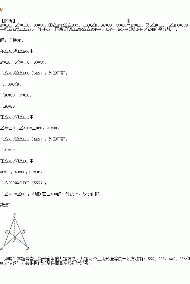 如图所示,在∠AOB的两边上截取AO=BO,CO=DO,连接AD、BC交于点P,则①△AOD≌△BOC;②△APC≌△BPD;③P在∠AOB的平分线上,其中结论正确的是( )